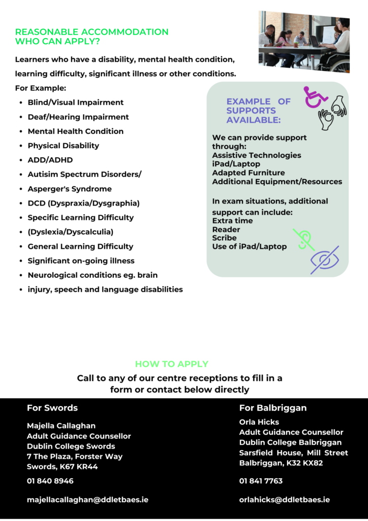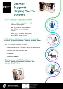 Dublin College Balbriggan and Swords can provide supports to individuals with a range of learning needs.